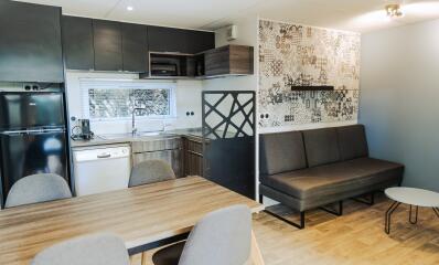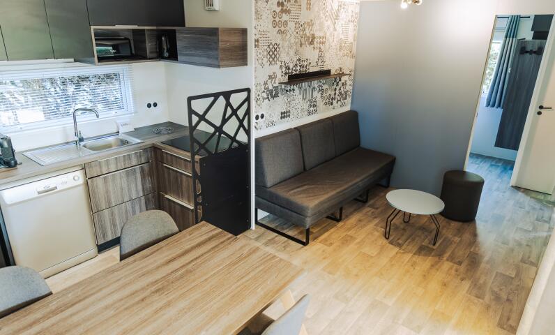 Wohnzimmer mit Essbereich und elektrischer Heizung. Flachbildfernseher, WLAN und Klimaanlage.