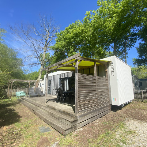 Terraza semicubierta de madera con mobiliario de jardín (1 mesa, 6 sillas y 2 tumbonas).