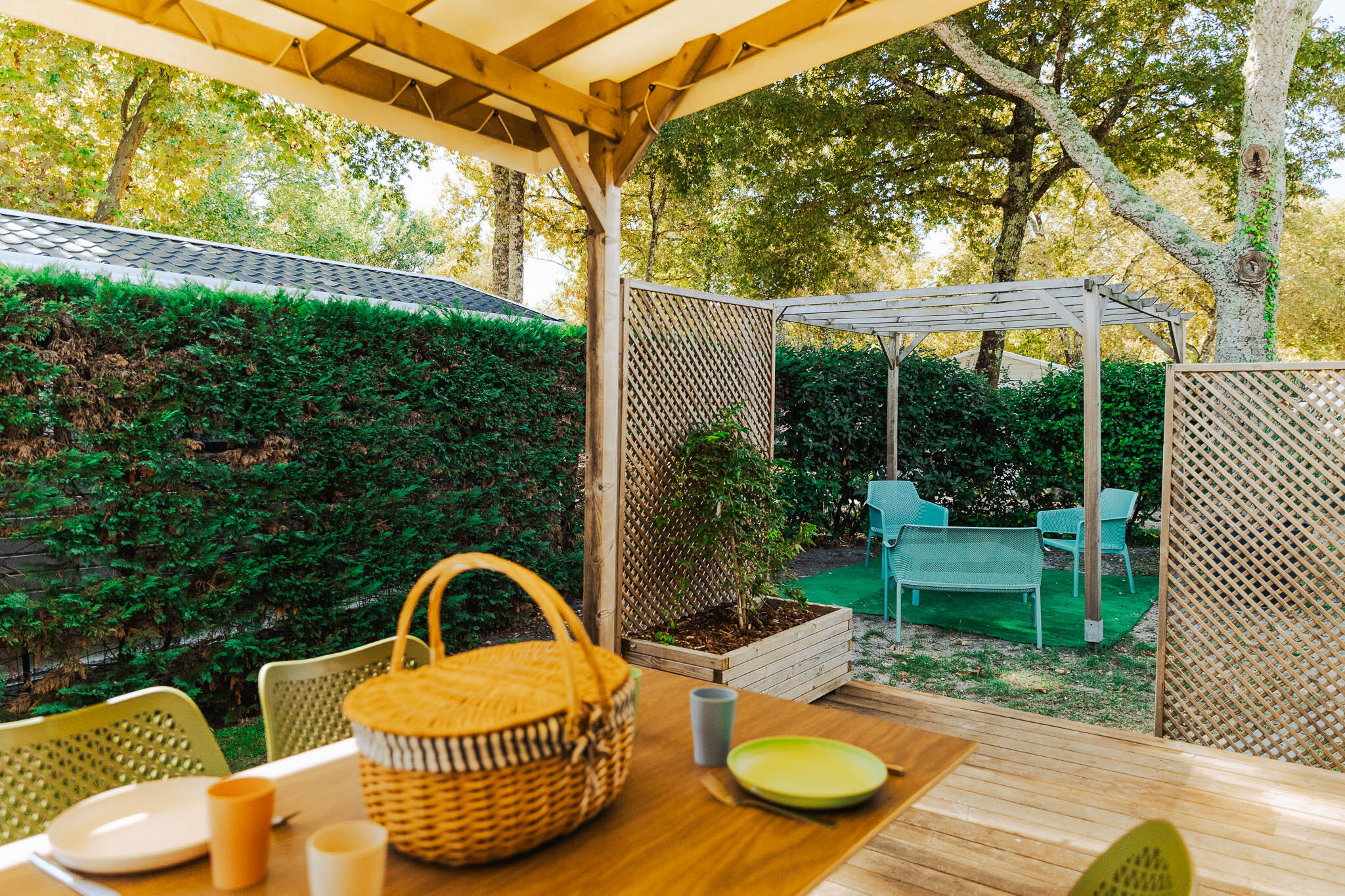 Parcela ajardinada. Terraza de madera semicubierta y salón de jardín bajo pérgola que incluye: sillones y mesa de centro + 1 mesa, 4 sillas y 2 tumbonas. Barbacoa.
