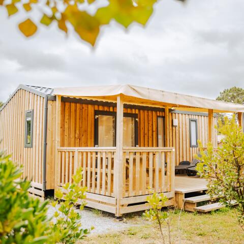Halfoverdekt houten terras met tuinmeubilair (1 tafel, 6 stoelen en 2 ligstoelen).