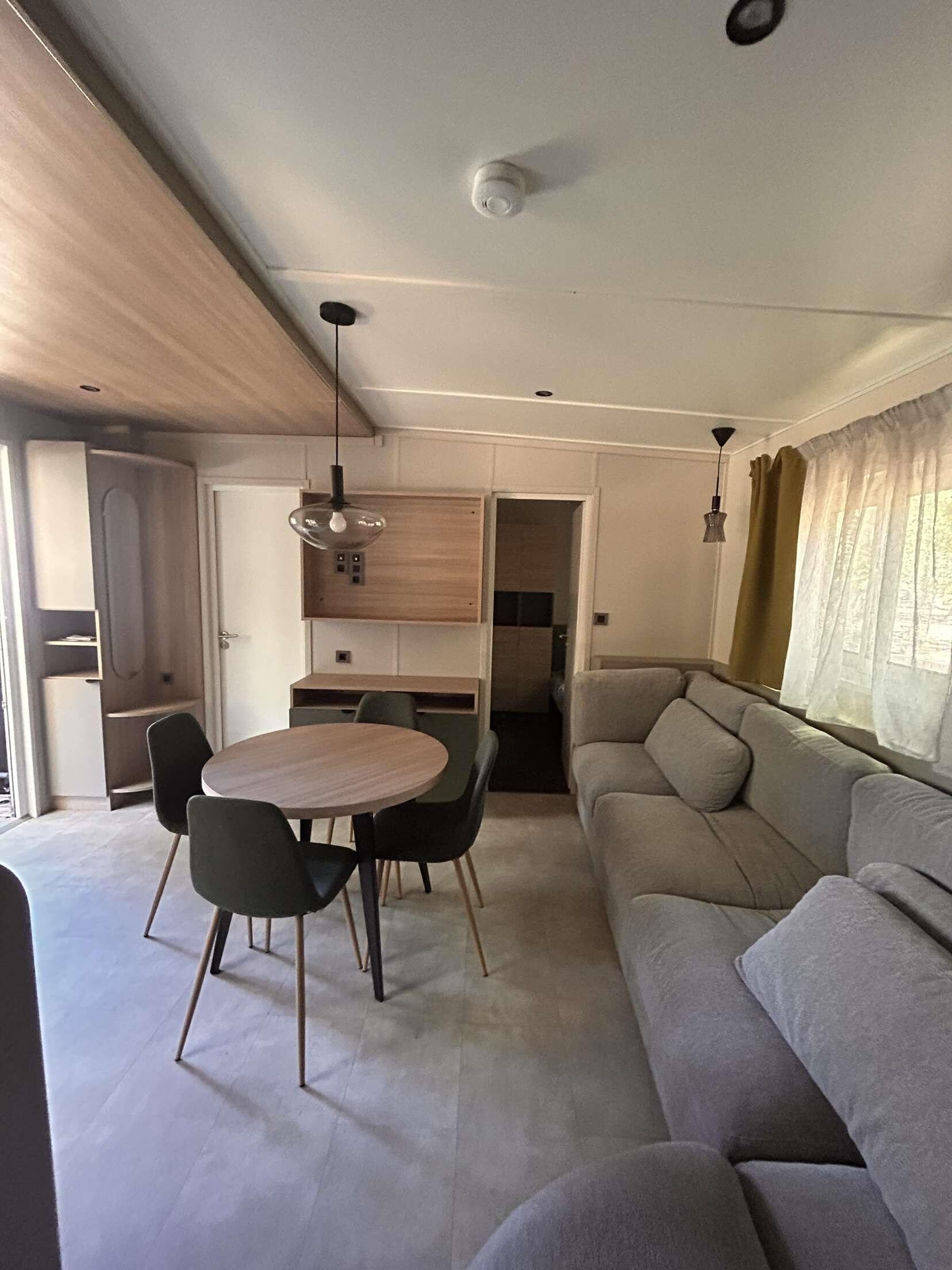 Een woonkamer met eethoek en elektrische verwarming. Flatscreen-tv en wifi.